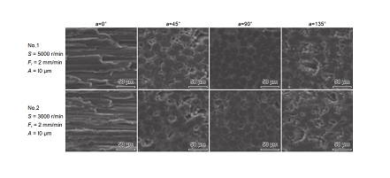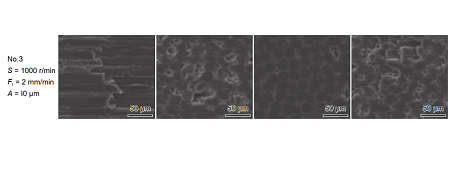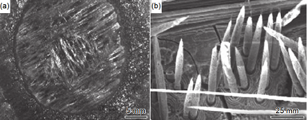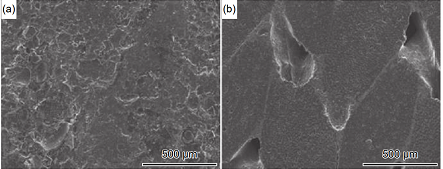 圖 9 2 維 C/SiC 復合材料的銑削加工形貌圖:(a)切削速率 vc = 40 m/min;進給速率 f = 0.01 mm/min;(b)壓縮纖維斷