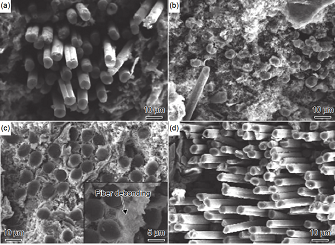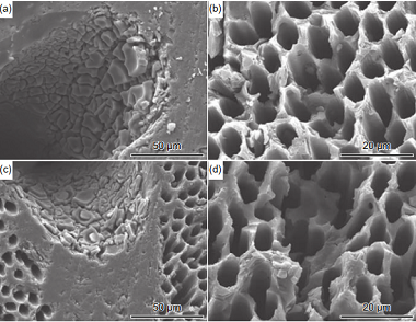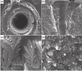 圖 14 C/SiC 復合材料的飛秒激光加工 SEM 圖 (a)孔入口;(b)孔截面;(c)類硅酸鹽枝晶;(d)孔內(nèi)壁