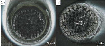 圖 16 C/SiC 復合材料的普通激光加工與加入保護氣體后燒蝕形貌對比圖 (a)普通激光加工;(b)加入保護氣體后加工