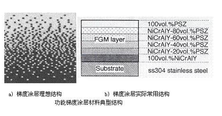 在熱障涂層中,由于粘結(jié)層金屬和氧化鋯陶瓷的熱膨脹系數(shù)差異較大,這種差異將導(dǎo)致涂層內(nèi)應(yīng)力過(guò)大,并且在熱循環(huán)條件下常發(fā)生陶瓷涂層的早期破壞。為了減小內(nèi)應(yīng)力,提高涂層與基體的結(jié)合強(qiáng)度,材料科學(xué)家開(kāi)始在常規(guī)熱障涂層中引入功能梯度材料制備技術(shù)。