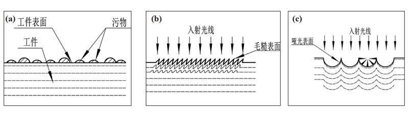 圖 1 噴砂粒子的形狀對(duì)工件表面形貌的影響:(a) 噴砂處理前;(b) 鋒利邊緣的不規(guī)則粒子處理后;(c) 丸狀粒子處理后