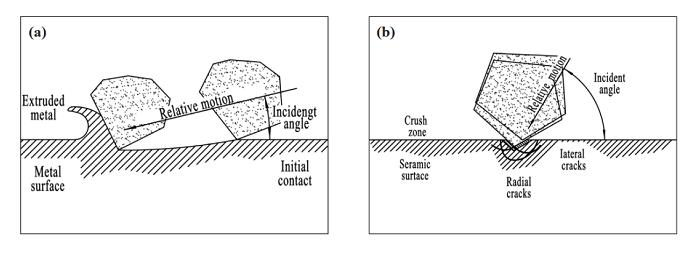 圖 2 噴砂型沖蝕磨損機(jī)理:(a) 小角度沖蝕;(b) 大角度沖蝕