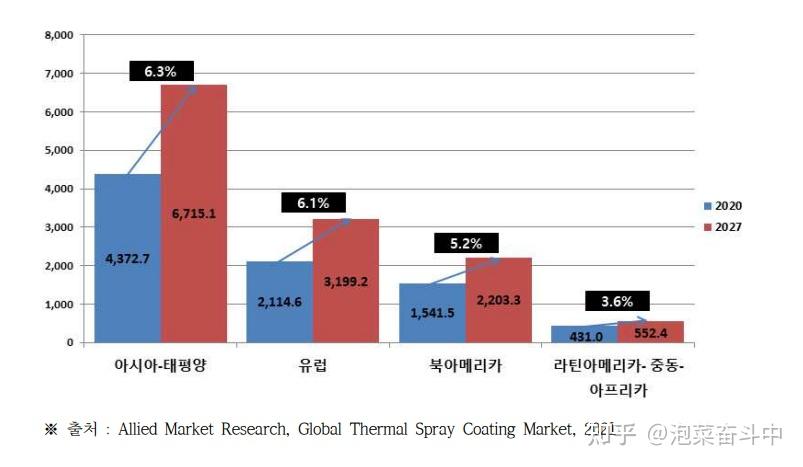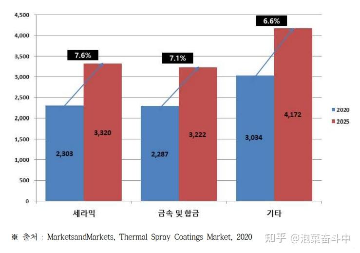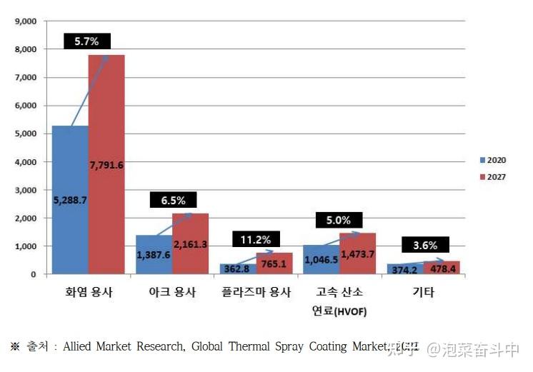 讓我們定睛來看一下,雖然等離子熱噴涂的全體市場占比不是最高的,但是它的增速卻是所有噴涂方法中最快的。達到了11.2%。