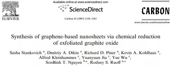 該文2007年由美國西北大學(xué)的SonBinh T. Nguyen和Rodney S. Ruoff教授等人發(fā)表于Carbon。截至2021年2月17日,該文累計被引10,520次。