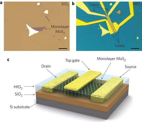 二維材料在下一代納米電子器件中的應(yīng)用很有吸引力,因為與一維材料相比,用它來制造復(fù)雜的結(jié)構(gòu)相對容易。研究最廣泛的二維材料是石墨烯,這是由于其具有豐富的物理性質(zhì)和高電子遷移率。但是,原始石墨烯不具有帶隙,而帶隙這一性質(zhì)對于包括晶體管在內(nèi)的許多應(yīng)用都是必不可少的。設(shè)計石墨烯帶隙會增加制造復(fù)雜性,或者將遷移率降低到應(yīng)變硅膜的水平,或者需要高電壓。盡管單層MoS2具有1.8 eV的大固有帶隙,但先前報道的在0.5-3 cm2·V-1·s-1范圍內(nèi)的遷移率對于實際設(shè)備而言仍然太低。此文中,作者使用氧化鉿柵極電介質(zhì)獲得了超過200 cm2·V-1·s-1的室溫單層MoS2遷移率,接近石墨烯納米帶,并展示了電流開/關(guān)比為1×108,待機功耗極低的室溫晶體管。由于單層MoS2具有直接的帶隙,因此可用于構(gòu)造帶間隧場效應(yīng)晶體管,與傳統(tǒng)晶體管相比,其功耗更低。單層MoS2還可以在需要薄透明半導(dǎo)體的應(yīng)用中補充石墨烯,例如光電子學(xué)和能量收集領(lǐng)域。
