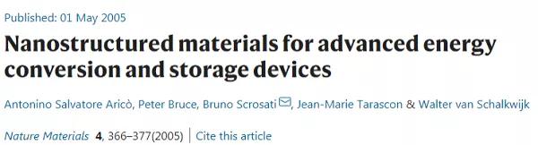 該文在2005年由羅馬薩皮恩扎大學(xué)Bruno Scrosati教授等人發(fā)表于Nature Materials。截至2021年2月17日,該文累計被引6,958次。