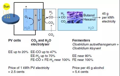針對這一問題,德國西門子公司的Guenter Schmid(通訊作者)團(tuán)隊(duì)[1]利用了可商用的銀基氣體擴(kuò)散電極。該電極通常使用在工業(yè)規(guī)模的氯-堿電解過程中,而研究人員則以此電極作為二氧化碳電解槽的陰極。檢測發(fā)現(xiàn),由此形成的電解槽在超過1200小時(shí)的連續(xù)運(yùn)行后,電流密度依然可高達(dá)300?mA cm–2。這一二氧化碳電解槽可被連接到發(fā)酵模塊(fermentation module),這樣一來,從電解槽出來的合成氣可以直接轉(zhuǎn)化成具有高碳選擇性的丁醇和己醇。研究計(jì)算顯示。光伏電能、二氧化碳和水轉(zhuǎn)變成醇類的法拉第效率可接近達(dá)到100%。利用這一雜化系統(tǒng),研究表示人工光合成高價(jià)值化學(xué)品(丁醇/己醇)可能達(dá)到幾萬噸每年的產(chǎn)量,已經(jīng)接近工業(yè)化規(guī)模水平。
