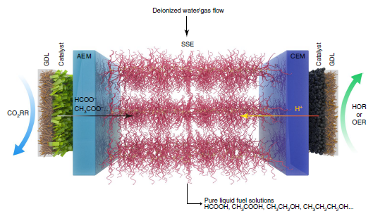 萊斯大學(xué)的汪淏田(通訊作者)團(tuán)隊(duì)[2]利用固態(tài)電解質(zhì)在電池中實(shí)現(xiàn)了二氧化碳連續(xù)電催化轉(zhuǎn)化生成純液體燃料溶液。在這個(gè)過程中,電化學(xué)產(chǎn)生的陽離子(如氫離子)和陰離子(如甲酸根離子)相互結(jié)合形成不含其他離子的純產(chǎn)物溶液。在陰極上利用甲酸選擇性(法拉第效率大于90%)和極易規(guī)模化的鉍催化劑,研究證實(shí)了該過程可生產(chǎn)濃度達(dá)12M的純甲酸溶液。研究也展示了長達(dá)100小時(shí)的0.1M甲酸的連續(xù)穩(wěn)定生產(chǎn),同時(shí)催化選擇性和活性幾乎不變。同樣地,利用銅催化劑,研究還實(shí)現(xiàn)了如醋酸等其他無電解質(zhì)液體產(chǎn)物。這一工作在可規(guī)模化電池上實(shí)現(xiàn)了二氧化碳電催化直接還原成甲酸的過程,展示了二氧化碳電還原的工業(yè)化前景。