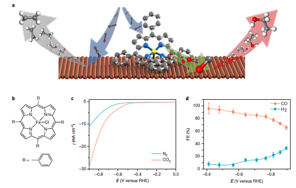 多倫多大學(xué)的Edward H. Sargent(通訊作者)課題組[3]提出了一種分子-金屬催化劑表面的協(xié)同催化劑設(shè)計(jì)。這一設(shè)計(jì)旨在建立富含反應(yīng)中間體的局部環(huán)境,從而提高從二氧化碳和水電合成乙醇的能力。研究人員首先利用一系列能夠催化二氧化碳形成一氧化碳的卟啉基金屬復(fù)合物對銅表面進(jìn)行功能化,再利用DFT計(jì)算和拉曼、X射線等譜學(xué)表征,發(fā)現(xiàn)局部一氧化碳展現(xiàn)出高濃度特點(diǎn),能夠有利于碳碳耦合、控制反應(yīng)路徑以高效生產(chǎn)乙醇。驗(yàn)證實(shí)驗(yàn)的結(jié)果,二氧化碳-乙醇轉(zhuǎn)變的局部電流密度也達(dá)到了(124?mA?cm?2)(?0.82 V vs RHE),但由于抑制氫氣生成的問題沒有解決,其法拉第效率略有下降(41%)。這一催化劑后又被集成到薄膜電極組裝系統(tǒng),也實(shí)現(xiàn)了13%左右的全局能量效率。