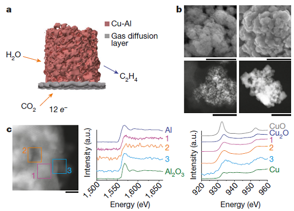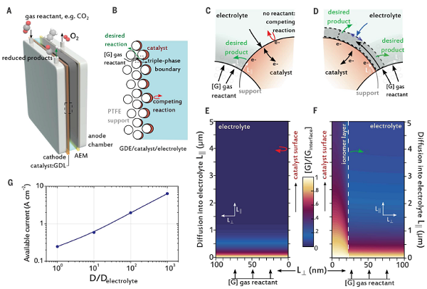 二氧化碳電化學(xué)還原產(chǎn)生C2化學(xué)品的另外一個(gè)挑戰(zhàn)是生成的氣體都是疏水的,而產(chǎn)物反應(yīng)又需要水分子的參與。氣體往往需要擴(kuò)散穿過液態(tài)電解質(zhì)與催化劑表面接觸,這也限制了C2生產(chǎn)能力的進(jìn)步。為了克服這一問題,多倫多大學(xué)的Edward H. Sargent和David Sinton(共同通訊作者)合作[4]將離子聚合物(ionomer)組裝體和銅電催化劑結(jié)合形成新型3D催化劑。這一復(fù)合催化劑具有離子聚合物體相異質(zhì)結(jié)(CIBH)結(jié)構(gòu),能夠分離氣體、離子和電子輸運(yùn)。這一結(jié)構(gòu)包含金屬層和超精細(xì)離子聚合物層,其中離子聚合物層進(jìn)行了疏水和親水功能化,能夠組裝形成結(jié)構(gòu)差異化的形貌,并有利于氣體和離子在金屬表面的輸運(yùn):氣體傳輸可通過疏水區(qū)域的側(cè)鏈進(jìn)行提升,使氣體擴(kuò)散得以擴(kuò)展;同時(shí),水的吸收和離子出現(xiàn)在親水區(qū)域。由此帶來的結(jié)果是,活性位點(diǎn)附近的氣體反應(yīng)物、離子和電子大幅增加,反應(yīng)界面由亞微米尺度提升到了幾個(gè)毫米水平。以此為策略設(shè)計(jì)的催化劑在7M磷酸鹽電解質(zhì)中實(shí)現(xiàn)了高效的二氧化碳電還原反應(yīng),乙烯的局部電流密度可以到達(dá)1.3 A cm?2(陰極能量效率為45%)。這一電流密度是迄今為止在二氧化碳生產(chǎn)C2化學(xué)品過程中觀測到的最高值,已經(jīng)可以完全滿足工業(yè)規(guī)模相關(guān)的應(yīng)用需求。