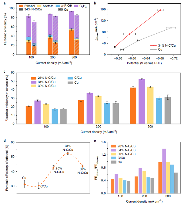 而在二氧化碳電還原反應(yīng)中,乙醇和乙烯是兩種主要的C2競爭產(chǎn)物。一般認(rèn)為,這兩種產(chǎn)物衍生自共同的關(guān)鍵中間體(HOCCH*),HOCCH*中碳氧鍵斷裂產(chǎn)生了乙烯。對二氧化碳電還原反應(yīng)進(jìn)行技術(shù)經(jīng)濟(jì)分析發(fā)現(xiàn),只有當(dāng)局部電流密度超過100 mA cm?2時(shí),C2產(chǎn)物才會開始產(chǎn)生經(jīng)濟(jì)效益。這意味著即使二氧化碳電還原反應(yīng)的全局電流密度超過10 mA cm?2,乙醇產(chǎn)物的法拉第效率需要進(jìn)一步提高才能推進(jìn)商業(yè)化。Edward H. Sargent(通訊作者)的團(tuán)隊(duì)[5]報(bào)道了一類可實(shí)現(xiàn)52%左右乙醇法拉第效率和31%乙醇陰極能量效率的催化劑。研究發(fā)現(xiàn),在銅表面涂覆氮摻雜碳層,賦予了催化劑強(qiáng)大的供電子能力,可以在HOCCH*中提高碳碳鍵的耦合、抑制碳氧鍵的斷裂,從而增強(qiáng)二氧化碳電還原過程中的乙醇產(chǎn)物選擇性。根據(jù)該研究的數(shù)據(jù),利用氮摻雜碳層改性后銅催化劑在電流密度超過100 mA cm?2時(shí)的總法拉第效率高達(dá)83%,乙醇的法拉第效率也大幅提高,超過了已有報(bào)道的最佳數(shù)值(41%)。