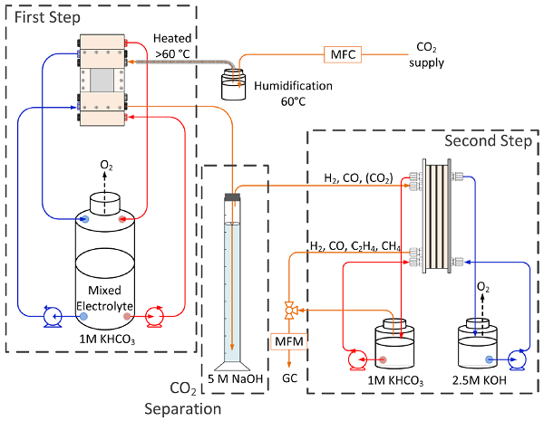 而近期,西門子公司的N. S. Romero Cuellar(通訊作者)等人[7]提出了一種新型的兩步電解法,展示了其工業(yè)化前景。作者利用兩塊分別以銀和銅作為氣體擴(kuò)散電極的液流電池,將兩步二氧化碳電化學(xué)還原過程進(jìn)行集成化。在這一集成系統(tǒng)中,作者實(shí)現(xiàn)了電解質(zhì)、氣體和電極之間的巨大三相邊界區(qū)域,由此可以在工業(yè)級電流密度水平操作運(yùn)行電化學(xué)還原過程。作者首先利用電壓/電流密度變化線掃分別研究兩個(gè)電解槽;而在分析第二個(gè)電解槽時(shí),作者假定供應(yīng)第一步的二氧化碳不會全部轉(zhuǎn)化成一氧化碳,即第一步的產(chǎn)物氣體是一氧化碳/二氧化碳的混合氣。以此假定,作者研究了不同比例混合氣的電還原反應(yīng),并發(fā)現(xiàn)二氧化碳的占比越高一氧化碳轉(zhuǎn)換成多碳產(chǎn)物的效率越低。因此,作者在第二步中用氫氧化碳吸附二氧化碳,從而有效增加集成系統(tǒng)的全局法拉第效率。根據(jù)計(jì)算,這一兩步策略的多碳產(chǎn)物(C2和C3)累計(jì)法拉第效率可以達(dá)到62%。