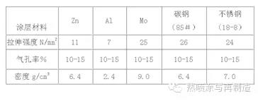 (1)涂層結構和特性。線材火焰噴涂的涂層結構為明顯的層狀結構,涂層中有較多的孔隙和氧化物夾渣。涂層性能依據(jù)噴涂工藝和噴涂材料的不同而各異,一般數(shù)據(jù)下表。