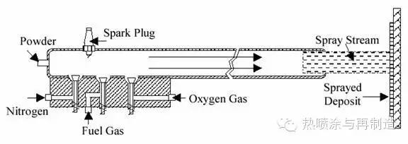 人們很早就發(fā)現(xiàn)可以根據(jù)燃燒的激烈程度將可燃氣體的燃燒過程分為:普通燃燒過程、爆燃過程、普通爆炸過程和爆轟過程。其中爆轟過程是最激烈和最不易獲得的,以氧氣和乙炔為例,在爆炸過程中爆炸中心的溫度高達3400℃以上,爆轟波產(chǎn)生的速率在1500m/s以上。研究表明在一端封閉的長1m-2m的管子中充滿氧氣和乙炔,在封閉端點燃該混合氣體可以獲得爆轟過程,同時產(chǎn)生爆轟波。上世紀50年代中期,美國聯(lián)合碳化物公司首先利用該原理制備了世界上第一臺爆炸噴涂設備(detonation gun,簡稱D-gun),用于各種零部件的涂層制備和零件修復。