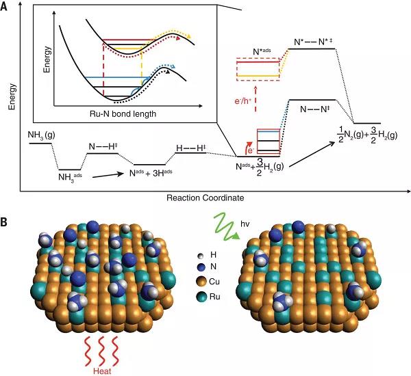 在以等離子體金屬納米顆粒為代表的催化劑發(fā)揮光熱催化效果時(shí),產(chǎn)生熱電荷載流子可活化反應(yīng)物、并降低反應(yīng)的總能壘。然而,在這過程中的熱和電子激發(fā)的關(guān)系尚不清楚。針對這一問題,萊斯大學(xué)的Peter Nordlander和Naomi J. Halas[3]等人通過研究氨氣分解來分析光和熱激發(fā)的作用。在銅合金納米構(gòu)造中,通過吸收光產(chǎn)生電子可活化在釕表面原子上的氮原子。通過測量不同波長、光強(qiáng)和催化劑表面溫度下的反應(yīng)速率,可以定量表觀活化能壘,厘清熱載流子的作用,并為設(shè)計(jì)高效光催化劑奠定了基礎(chǔ)。