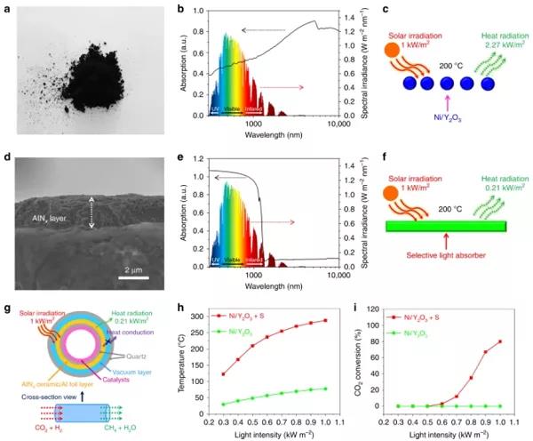 河北大學(xué)的李亞光、王淑芳和浙江師范大學(xué)的胡勇、日本國立物質(zhì)材料研究所葉金花(共同通訊作者)得益于添加可以同時(shí)吸收太陽光全譜和產(chǎn)生熱輻射的選擇性光吸收劑,制造了新型光熱轉(zhuǎn)換器件,可以吸收95%的太陽光,熱輻射僅為報(bào)道吸光材料的1/10,能夠在標(biāo)準(zhǔn)太陽光輻照下產(chǎn)生288 °C的高溫,是傳統(tǒng)吸光材料的三倍以上,可實(shí)現(xiàn)標(biāo)準(zhǔn)太陽光驅(qū)動下的二氧化碳甲烷化光熱化。不僅如此,他們還制備了負(fù)載單原子鎳的非晶Y2O3二維納米片,作為高效甲烷化催化劑。在選擇性吸光劑光熱器件和負(fù)載型非晶Y2O3二維納米片的協(xié)同作用下,實(shí)現(xiàn)了室外太陽光(0.52到0.7個(gè)標(biāo)準(zhǔn)太陽光強(qiáng)度)輻照的高效二氧化碳甲烷化,其轉(zhuǎn)化效率和甲烷產(chǎn)率可分別達(dá)到80%和7.5 l m?2 h?1。
