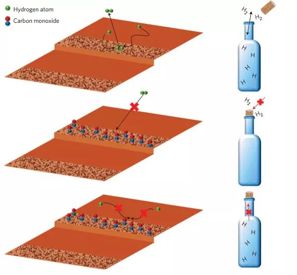 氫溢流是各種加氫反應(yīng)中常常存在的實(shí)驗(yàn)現(xiàn)象,指的是原本無法解離H2的位點(diǎn)吸附了H,這個(gè)位點(diǎn)上的H就說從能夠解離H2的位點(diǎn)溢流過來的。Sykes教授利用這種現(xiàn)象設(shè)計(jì)了一個(gè)很有意思的實(shí)驗(yàn)[7]。他們把Pd單原子負(fù)載在Cu表面。這時(shí)候Pd能夠解離H2,并且對CO具有很強(qiáng)的吸附能力;Cu表面無法解離H2,只能吸附解離后的H原子,并且對CO吸附能力弱。由于反應(yīng)的可逆性,H2也只能在Pd表面脫附而無法在Cu表面脫附。他們先通H2,H2在Pd單原子上解離,并溢流到Cu表面;再通CO,這時(shí)候CO會(huì)吸附在Pd單原子上,將其毒化。當(dāng)升溫時(shí),只有CO脫附之后,才會(huì)開始脫附H2。