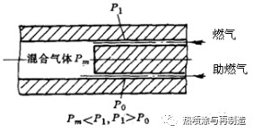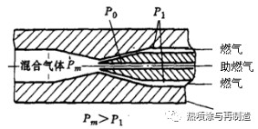 熱噴涂常采用的是預(yù)混燃燒方式。在預(yù)混燃燒中,燃料氣和助燃氣的混合方式主要有射吸式混合和等壓式混合兩種。射吸式混合指燃燒氣與助燃氣按噴射器原理混合,一般以助燃氣做噴射氣體,如圖2所示。
