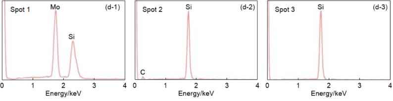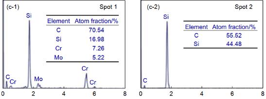 圖3 SiC-CrSi2-Cr3C2-MoSi2-Mo2C 涂層的形貌和相組成 (a)橫截面圖像;(b)表面圖像;(c-1)點(diǎn) 1 對(duì)應(yīng)的 EDS 分析;(c-2)點(diǎn) 2 對(duì)應(yīng)的 EDS 分析